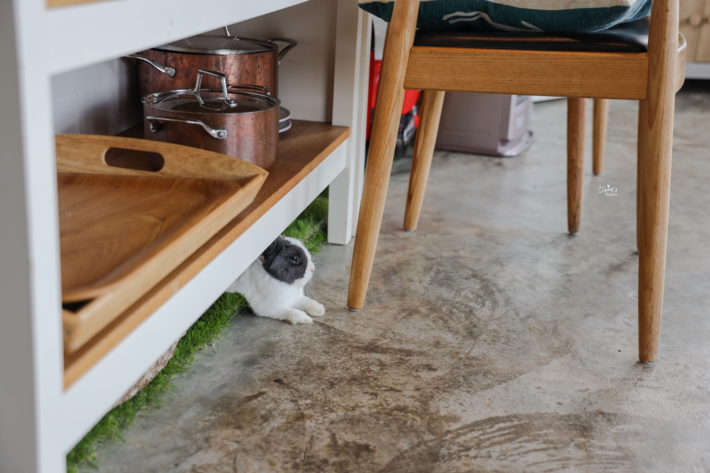 兔子的家在一樓的樓梯旁,人多的時候牠都待在籠子裡。隔天早上,就在我們整理好行李,下樓準備離開前,突然看到牠被放出來了,而且還在一樓到處跳來跳去,超可愛~~~(狀態顯示為已融化)。兔子比較膽小,想摸牠或是抱牠的話,動作要輕柔一點才行。