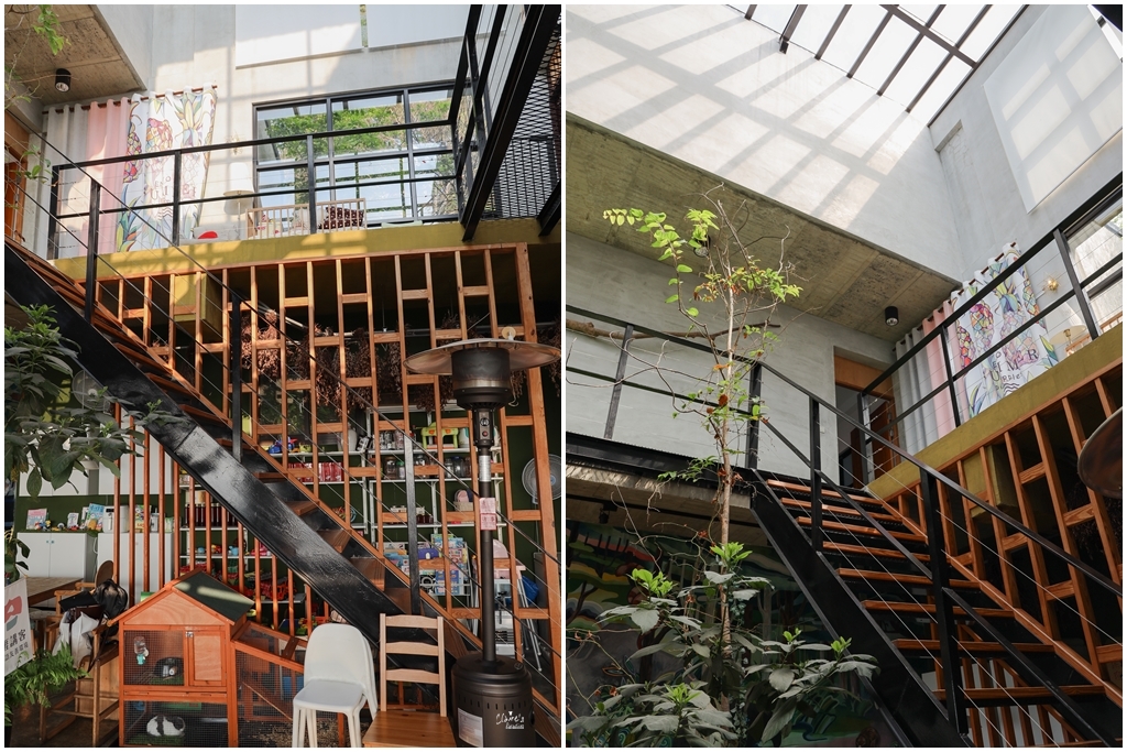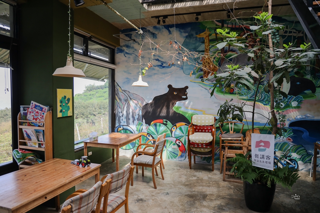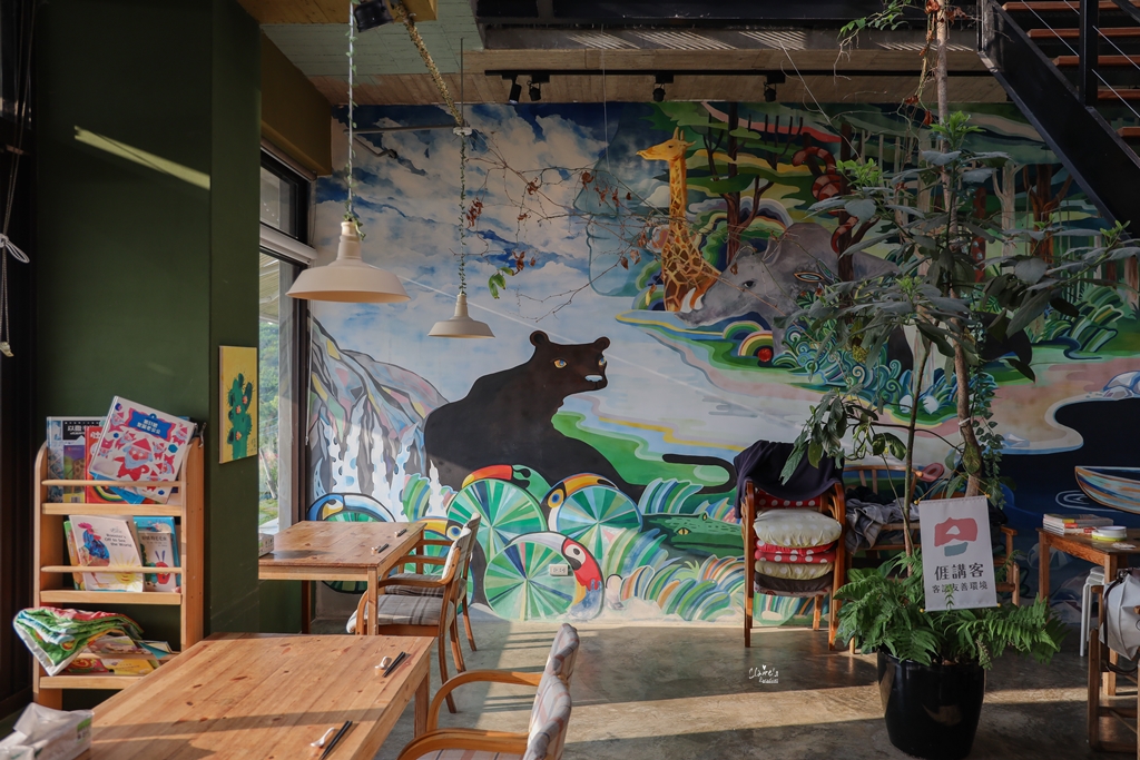 一樓同時也是用餐地點,每一桌都有一定的間隔距離,位置很寬敞。天井的設計,以及四周皆為大面積窗戶,讓這棟建築有著絕佳的採光,後方整面的動物彩繪牆超級可愛,如果自己的家裡也可以布置成這樣就好了~