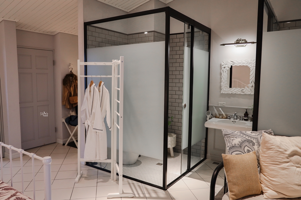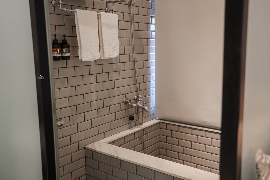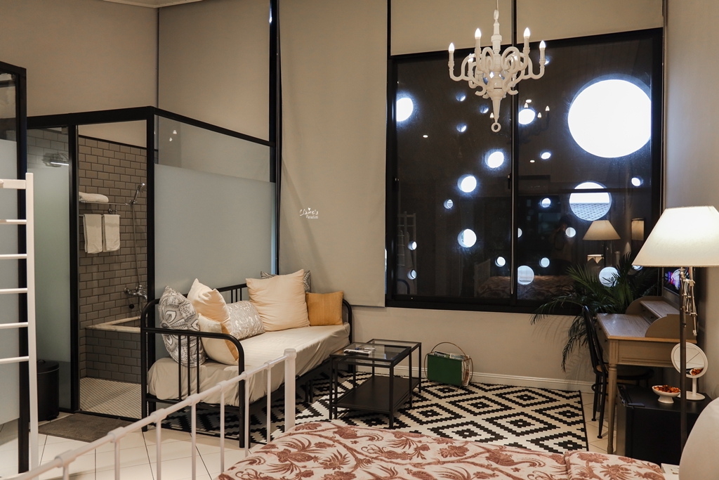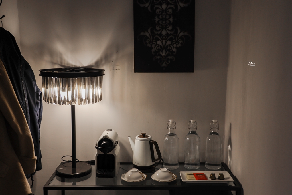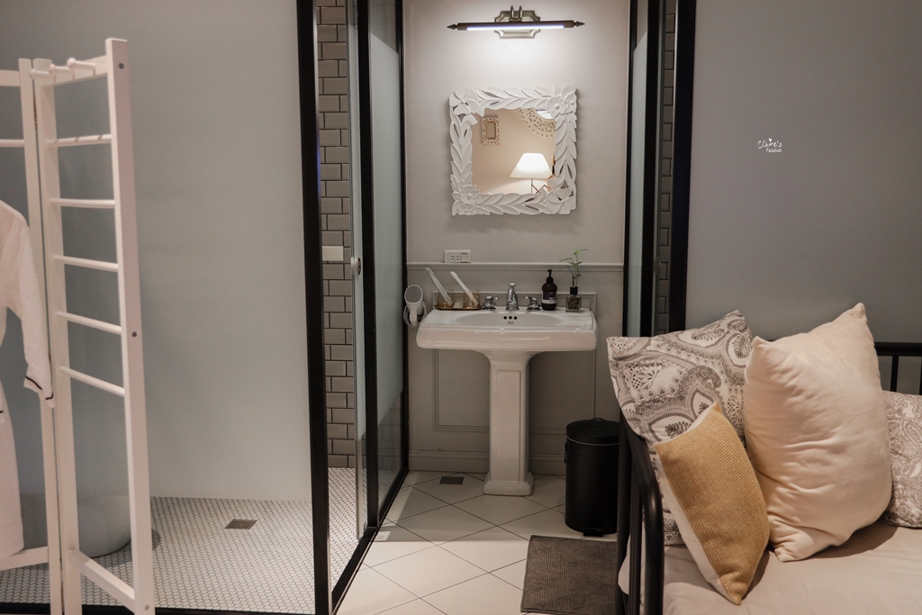 我們這次住的房型是位在四樓的I,之前原本在O與I之間做選擇,這兩間的風格都很法式,差別在於O房型的家具、地磚都是黑色系,而I房型則是白色系,掙扎很久,最後還是偏愛白色多一點,因此選了I房型。關於房型的資訊,點這裡可以看黑舍官網的介紹,要訂房的話點這裡。