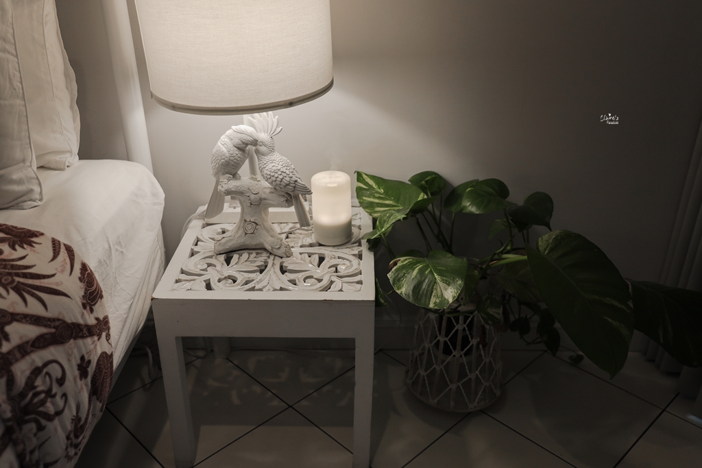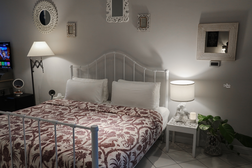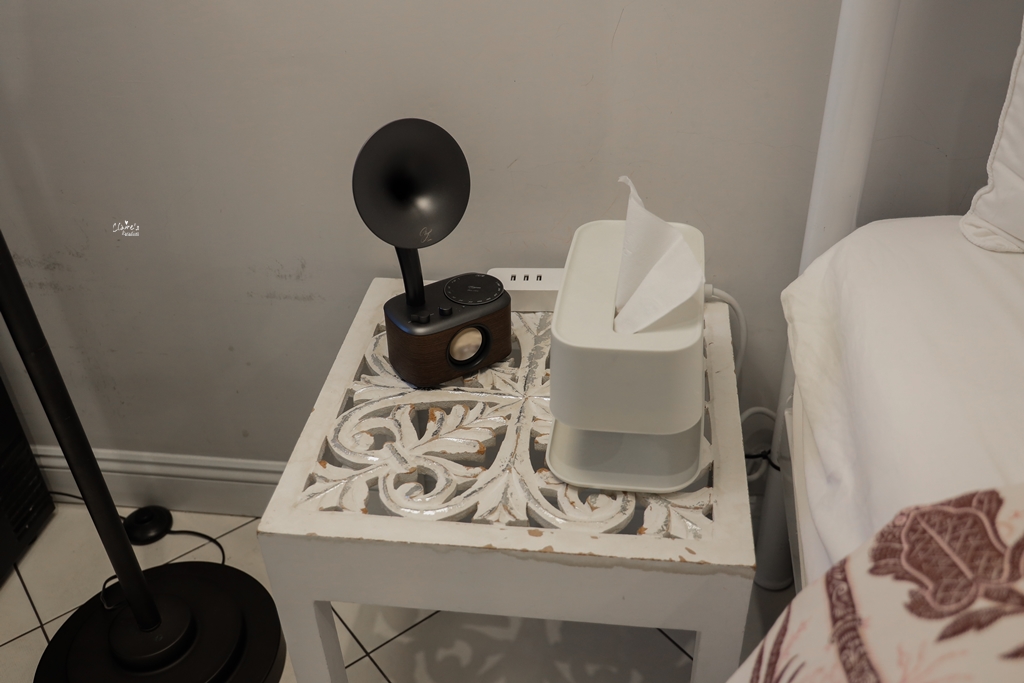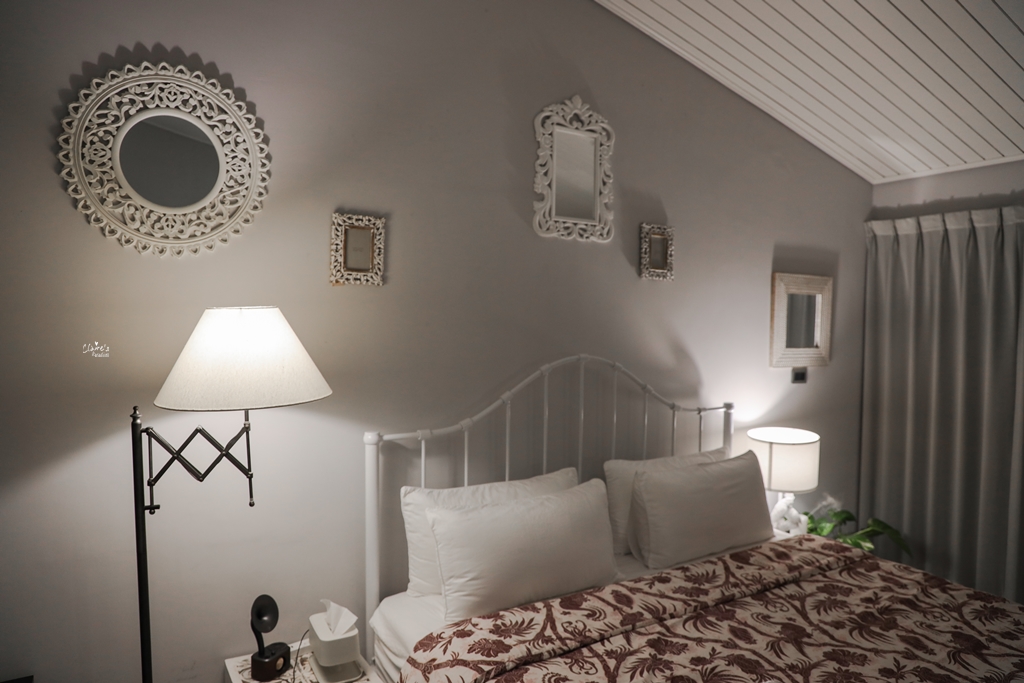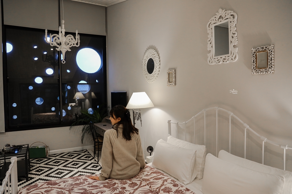 一踏進房間,顧不得前一秒還氣喘吁吁的(爬四樓真的有點累),立刻在房間裡奔跑了起來~~~這裡真的跟照片一模一樣,非常美!! 民宿主人將這間房型設定為南法花園,不管是床組、燭台造型的吊燈、擺飾都很有異國風。在不能出國的時期,就來黑舍滿足一下對於法國公寓的想像吧!