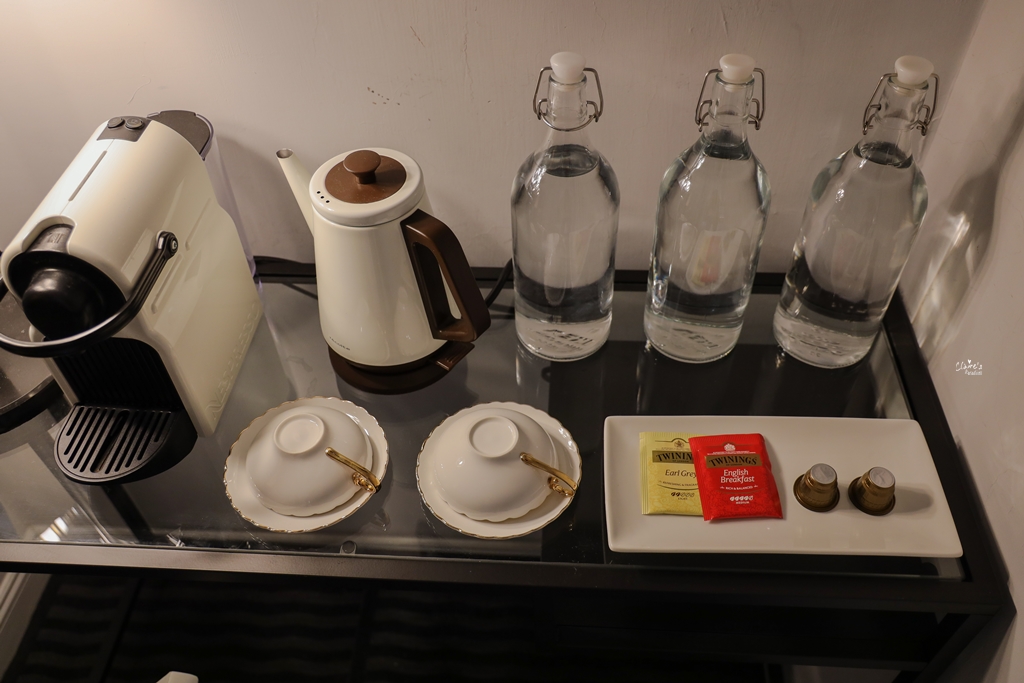 玄關的地方有鉤子可以懸掛衣物,水、Twinings茶包、Nespresso espresso膠囊咖啡與快煮壺也都放置在這一區。