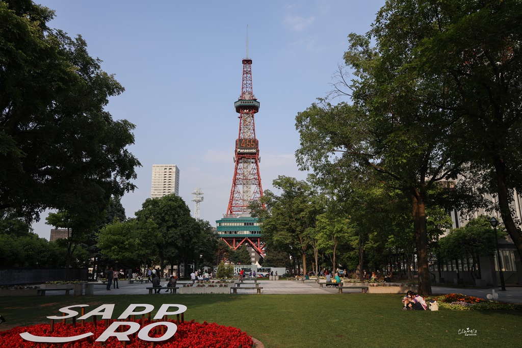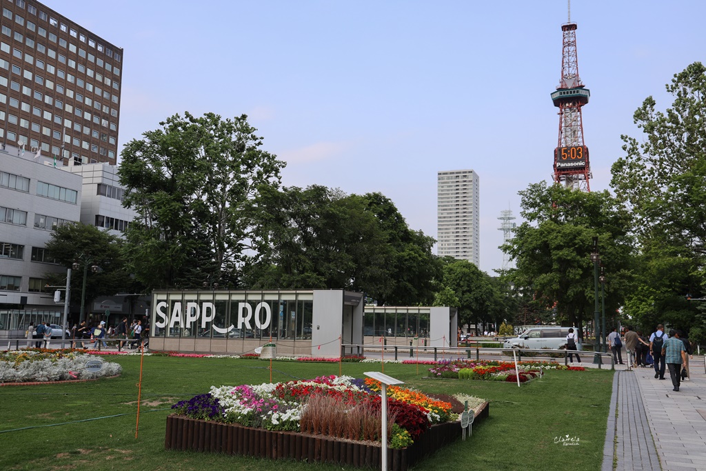 七月的大通公園,各種顏色的花朵正是盛開的時節,下午四點左右的天氣很舒適(今年的北海道真的超級熱…出發前還以為可以到北海道避暑,結果每天高溫都三十幾度),三三兩兩的人們,隨意的找了喜歡的位子坐著聊天喝咖啡,或是開心的與”Sappro”以及札幌電視塔合影。