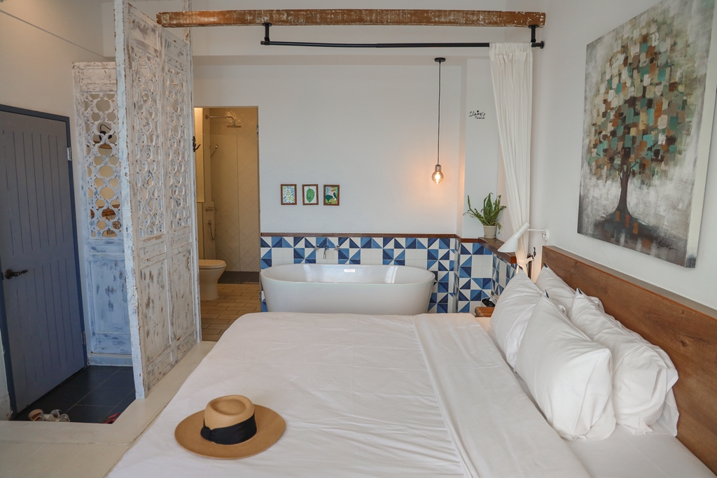 這個純白色的浴缸可說是房內的亮點! 白天的時候,拿起一本書、替自己泡一杯咖啡,在充滿陽光的房間內享受泡泡浴,還有南灣的海景相伴,我想像中的度假就應該是這個樣子。