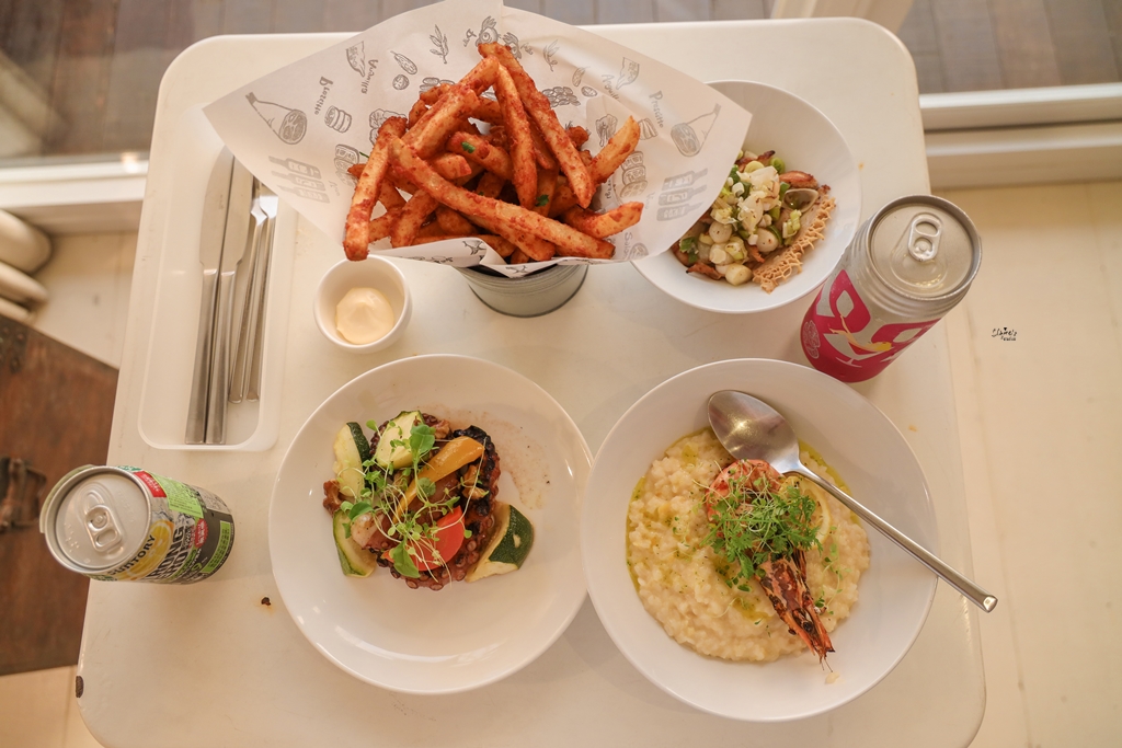 雖然房間內沒有桌子,但是可以好好利用一下陽台的桌子,把它搬進來就沒問題了 (事後有再把桌子歸位),大小剛好可以放置我們點的四道菜,桌上的兩罐啤酒是我們自備的,不想喝餐酒館的飲料,走幾分鐘到旁邊的7-11就有很多選擇了,我推薦臺虎精釀9.9%調酒系啤酒,長島冰茶跟草莓口味都不錯,喝完會有微醺感~