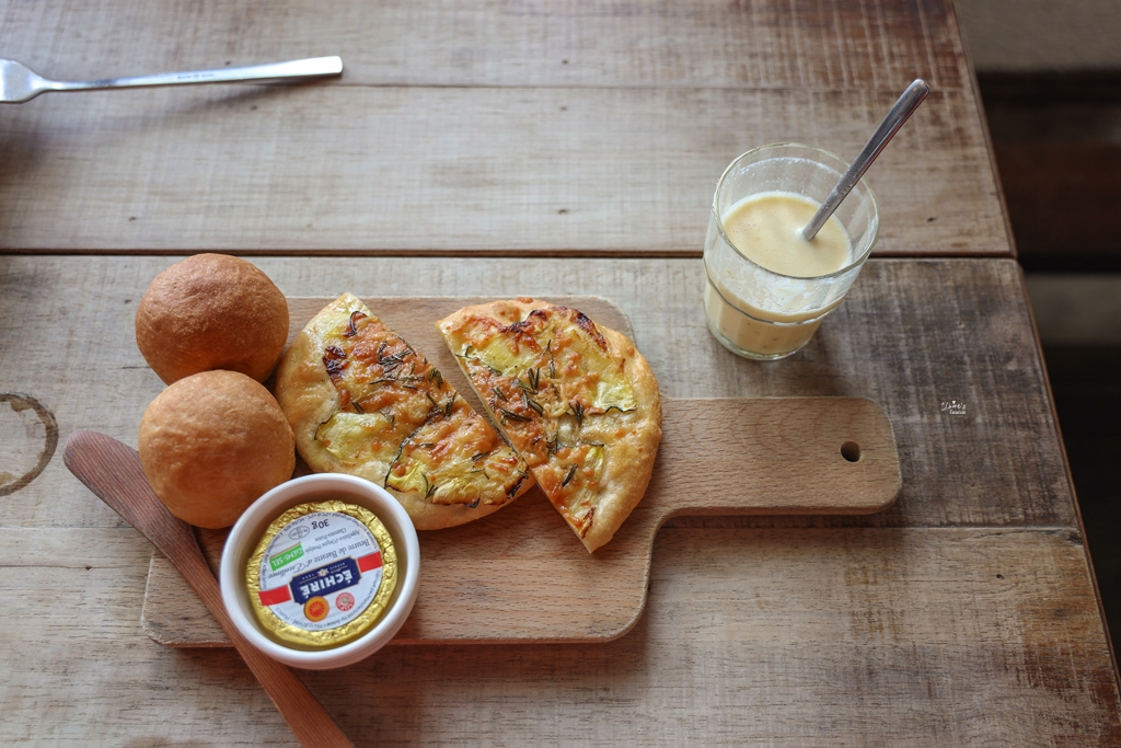 早餐是套餐的形式,會先送上一杯蘋果鳳梨優格,酸酸甜甜的超好喝! 第一道是蜂蜜餐包與櫛瓜起司佛卡夏,餐包可搭配法國進口的發酵奶油一起食用,佛卡夏很有嚼勁,但是我們一致認為太鹹了…
