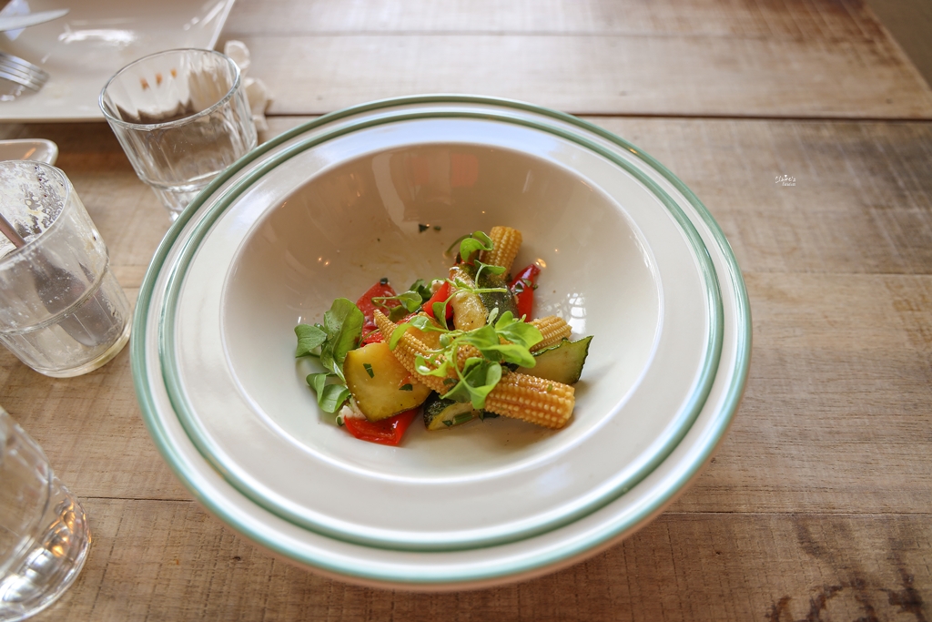 第二道是溫沙拉,有烤蔬菜、芝麻葉與山羊乳酪,乳酪真的有一股羊騷味,還好乳酪並不多,配著蔬菜還是把它吃下肚了。