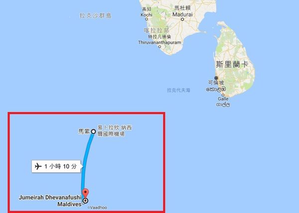 以前都只聽過這個地方,但沒人知道它的確切地點,查了地圖後才知道,馬爾地夫共和國位在印度跟斯里蘭卡的西南方,而我們此次要去的Jumeirah Dhevanafushi,則又在更下方,請見下圖紅框處