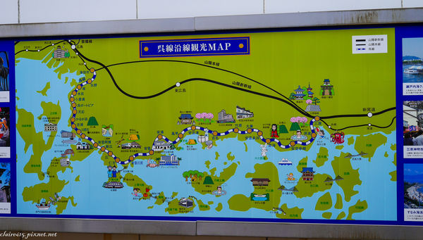 當天我本來也是預定九點以前要搭上船的,但…..理想總是跟現實有差距,因為錯過了前一班有停靠三原站的新幹線,所以到了快九點我們還在廣島車站等車…要特別注意的是,新幹線三原站不是每班列車都有停,再加上JR吳線的車次也不多,錯過一班可能要再等一個小時…渡輪的話約半小時有一班,出發前務必要看好車次以及船班的時間,以免延誤到下一個行程。
