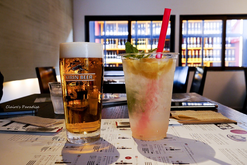 當天去的時候約11點多,已經有許多客人在用餐了,但幸好還沒客滿。裡面共兩層樓,滿喜歡店內的裝潢,雖然簡單卻很有質感。我們的位子在二樓,旁邊有一整排的酒櫃,原來這裡還提供了各式酒類可以搭配牡蠣,我們點了啤酒跟Mojito。日本的啤酒隨便點都好喝,調酒的話比較像加了一點點酒精的汽水。