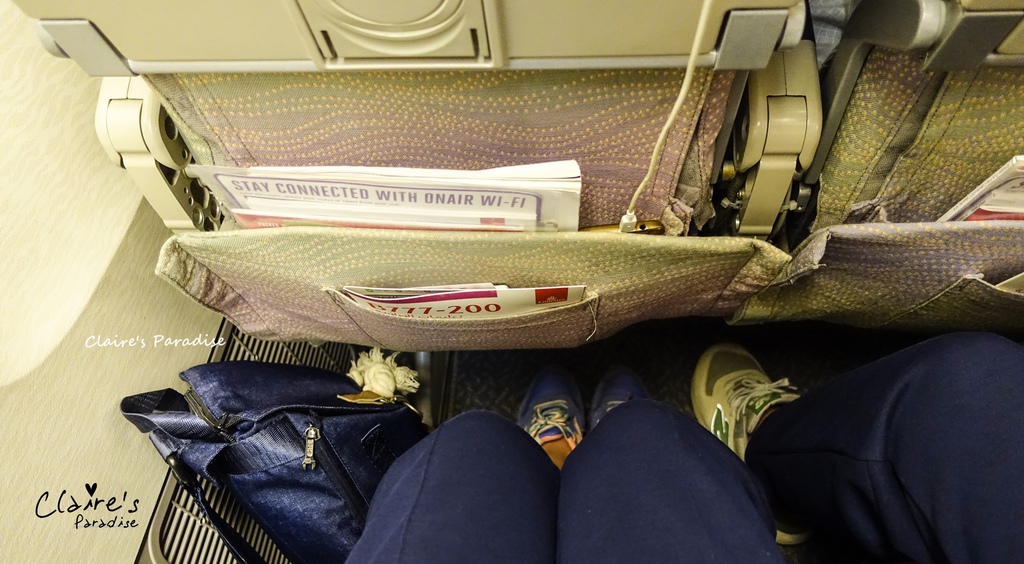 座位方面,原本很開心的選了上層的座位,樓上經濟艙的配置是2-4-2,而且旁邊還有置物櫃,但就在我暗自竊喜的想說搶到了好位子,還有機會可以經過商務艙參觀的時候,收到了座位更改的通知信…於是被迫移到下層,樓下就是一般3-4-3的配置,但座位是有稍微寬敞一些沒錯。我們兩個都算是腳長的人,從下圖可以看到坐著的時候距離前方還有一點空間可以伸展。