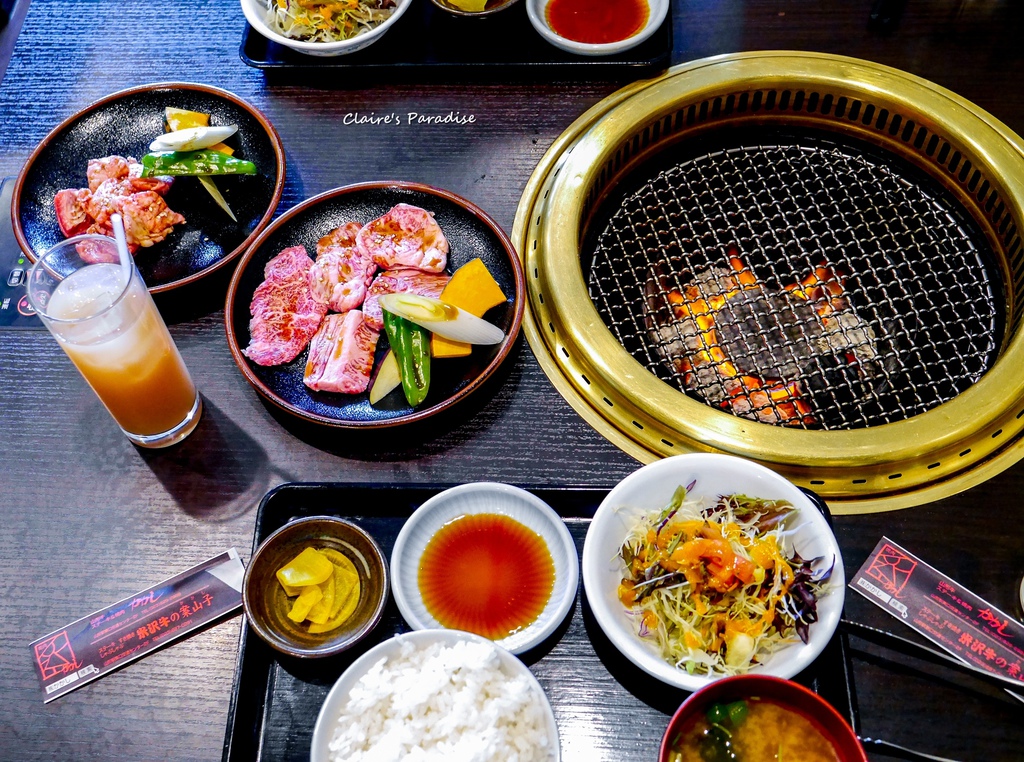 我們點了兩份不同部位的燒肉套餐,但因為我們沒有另外跟店家要中文菜單(從其他食記看到,店家似乎有提供翻譯本),所以我也不知道這兩種肉確切的名稱是什麼…套餐除了牛肉之外,有附白飯、湯、沙拉跟醃漬小菜。我們有另外點了水蜜桃汁。