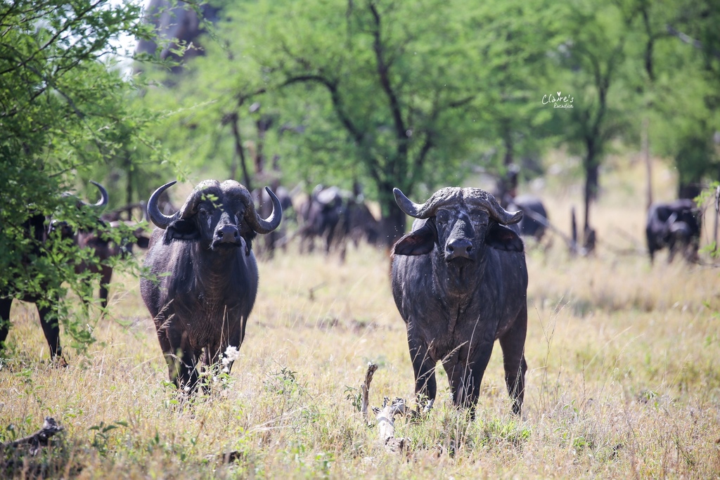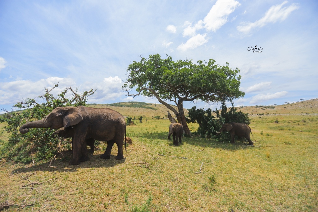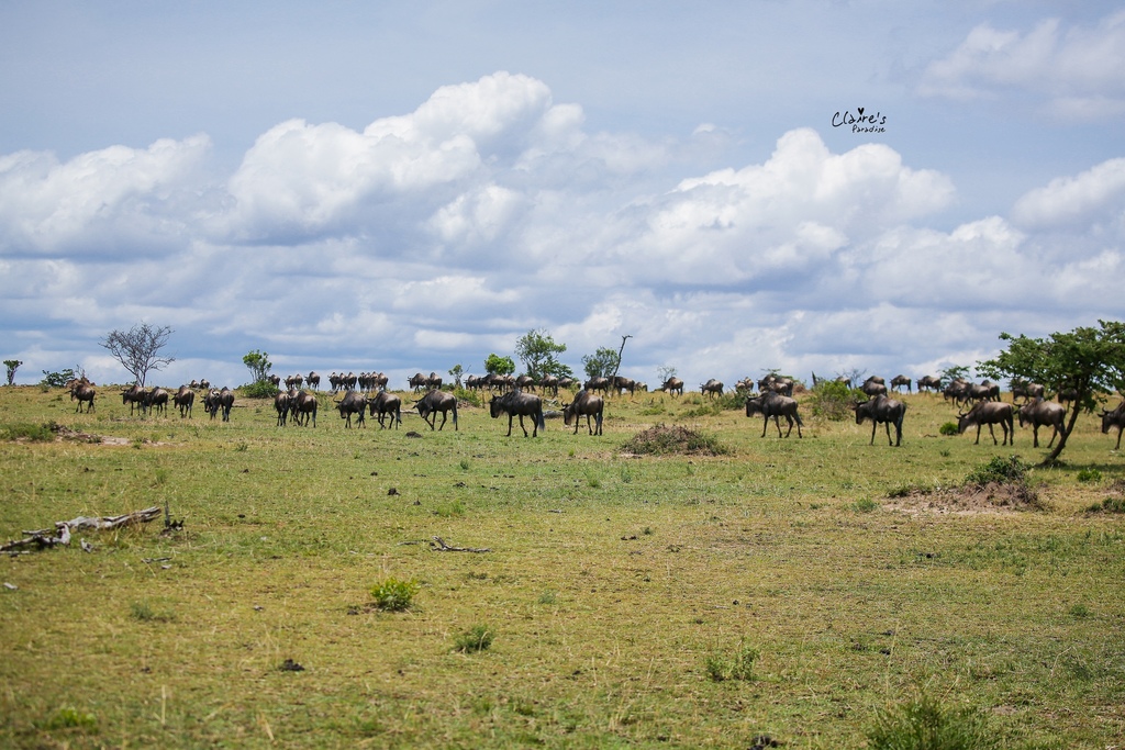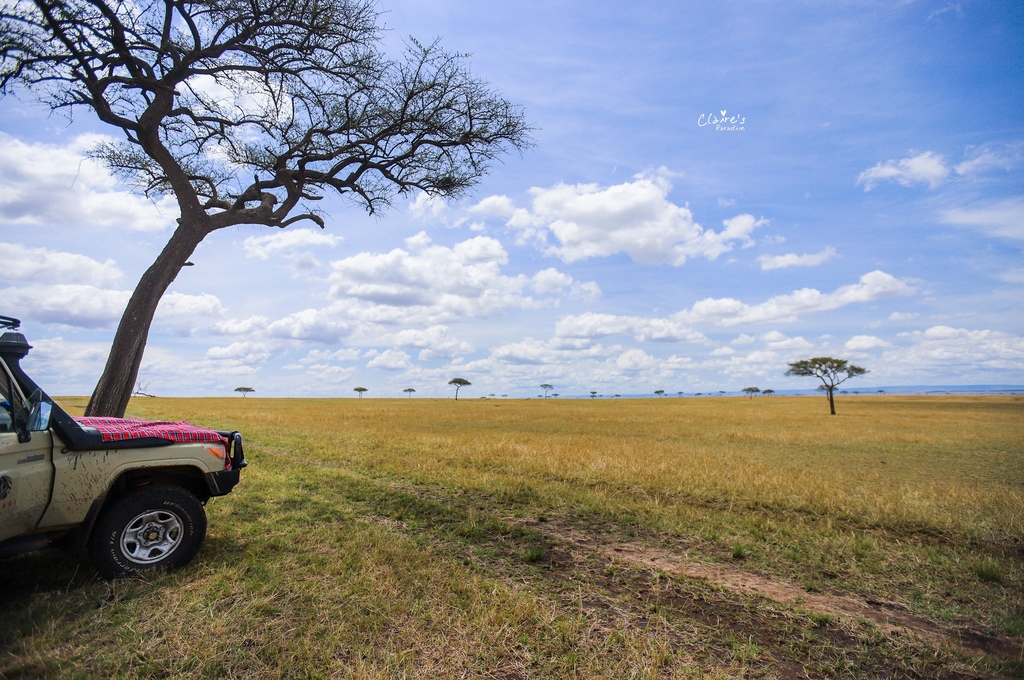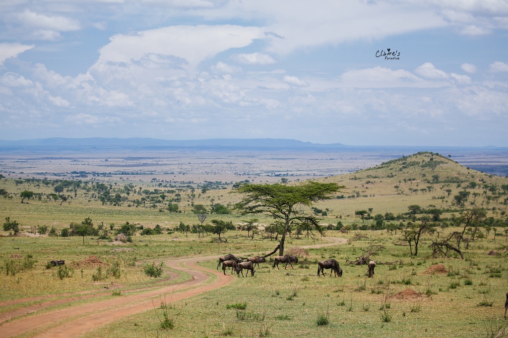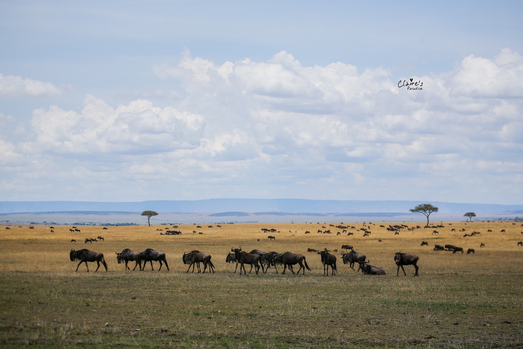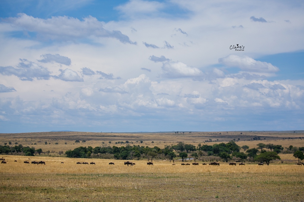 遠方的樹很有默契的連成一直線,這也是Kelly最喜歡的景色之一。而前方一個一個的小黑點全部都是牛羚,現場看更壯觀,但是對於有密集恐懼症的人來說,真的是有點太多了…