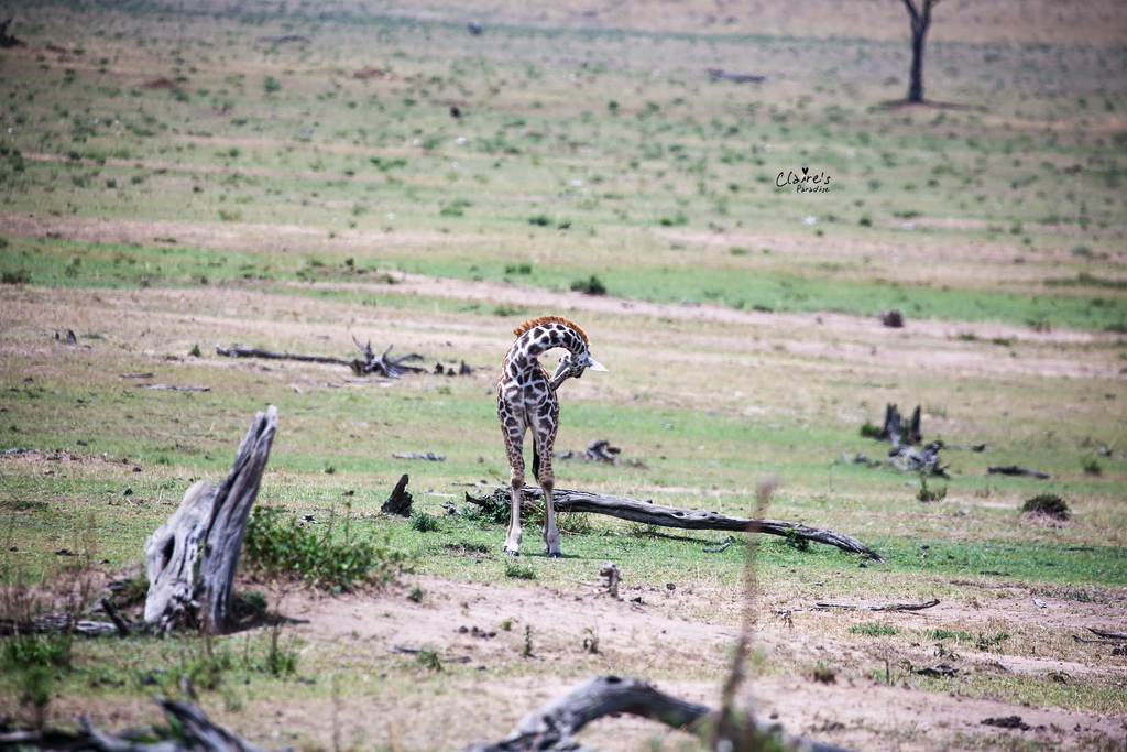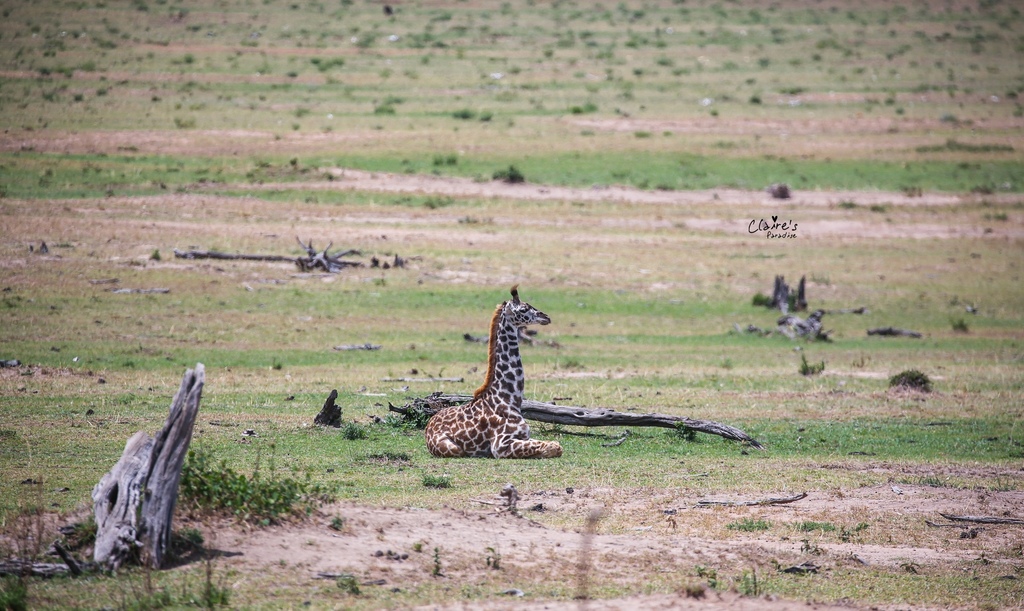 通常長頸鹿會維持站姿,因為坐著會增加被攻擊的危險性,但是這隻長頸鹿寶寶就在我們眼前一屁股坐下了…應該是因為附近很安全的緣故,所以可以安心休息一下。