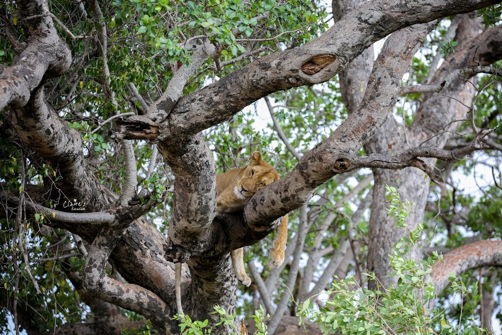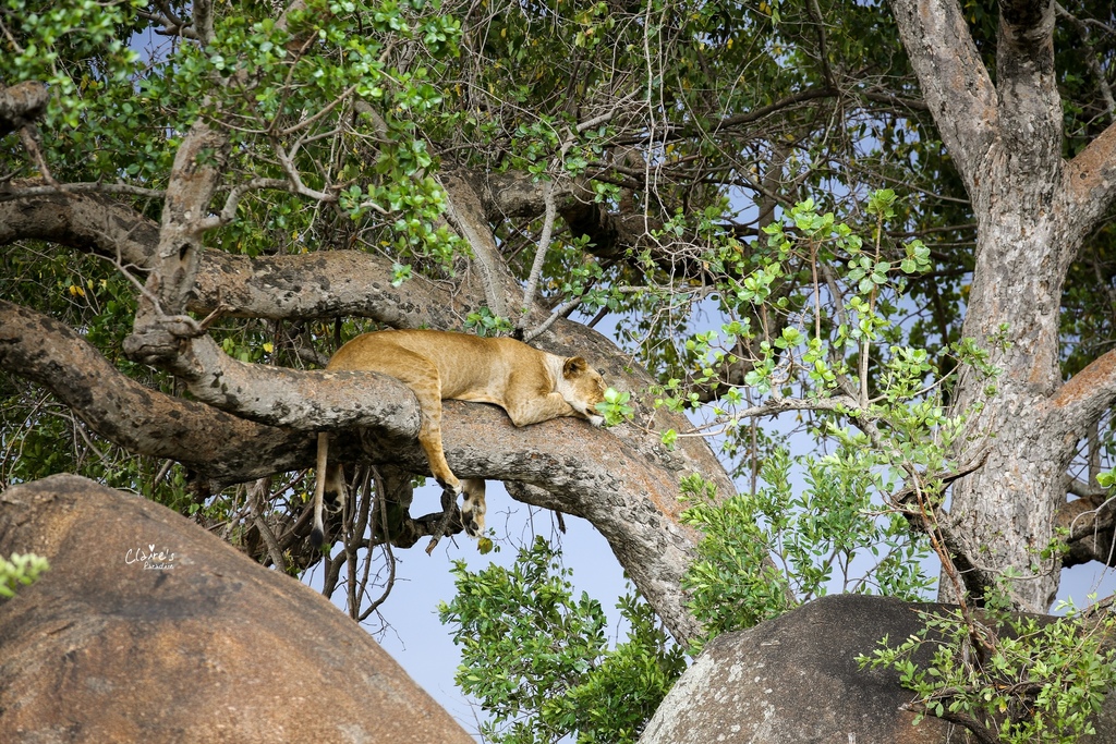 趕路中的最後一拍,是一隻趴在樹上睡午覺的獅子,看牠這麼放鬆的享受牠的午休時間,覺得有點羨慕…
