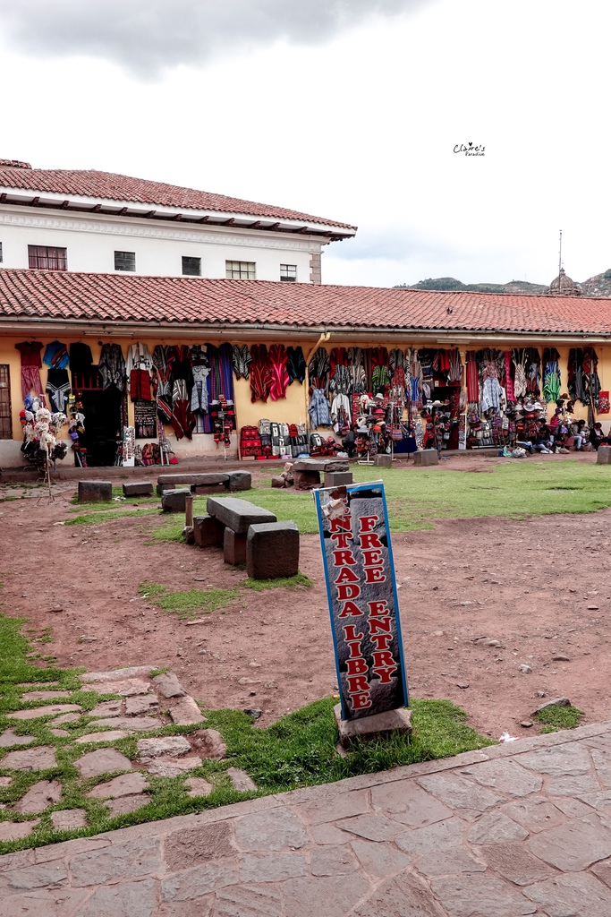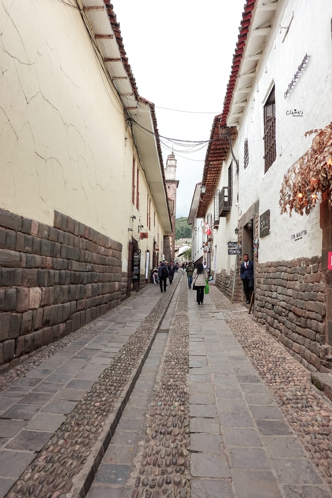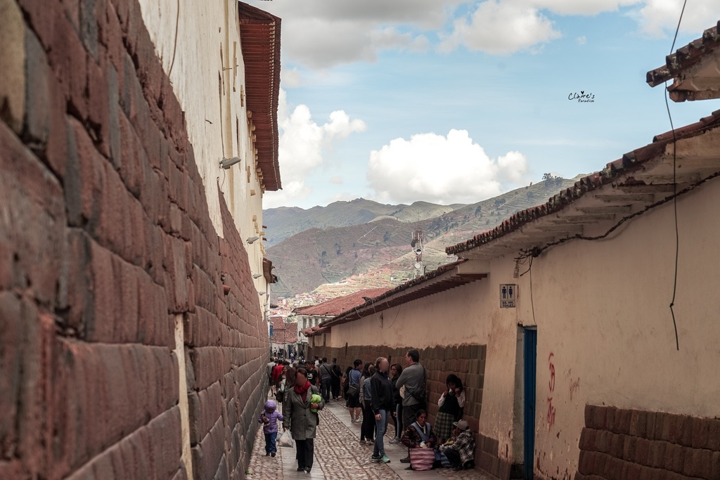 接著,我們跟著人群走入了另一條小徑,這裡的地上都是由石板路構成,熙來攘往的巷弄裡,有一些攤販在兜售紀念品。這裡還有一個景點”印加十二角石”,也就是印加石牆,由於印加人並未使用黏著劑,只是靠著精準的切割技術,就能讓形狀大小不一的石塊緊密接合在一起,縫隙之間連一張紙都無法插入,可惜我們並沒有找到十二角石…