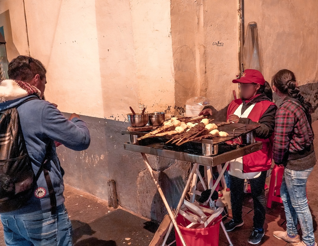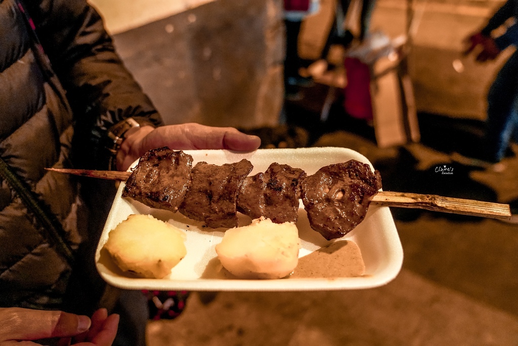 有了美麗的夜景,當然還要配美食才行~烤肉攤到了晚上就會出現在路邊,先前就聽說這種路邊攤烤肉非常好吃,於是冒著可能拉肚子的風險,我們也買了一串嘗嘗,印象中一串是5 Sol。