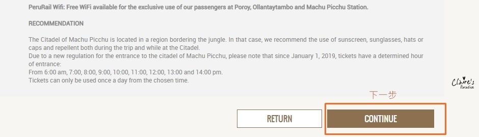 2.火車票:如果選擇從庫斯科或Ollantaytambo搭火車到熱水鎮(Aguas Calientes),那麼出發前也需要先上網購買火車票。