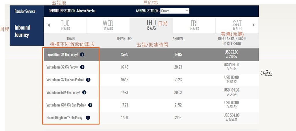 (2) 中間的兩欄是出發與抵達時間,從庫斯科發車的班次很少,而且通常都是一大早的時段,若是從Ollantaytambo出發,可以選擇的時段就多很多,甚至到晚上都還有車。