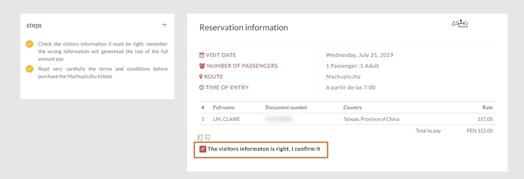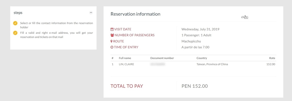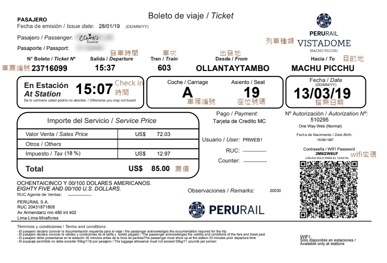 購票完成後,會收到PeruRail寄來的email,附件的pdf檔即為車票,裡面會有你的乘車資訊,包含姓名、護照、車票編號、車次、發車時間、車廂與座位編號…等,記得要把紙本印出來備查。車票右下角有一個wifi密碼,可以在候車時使用,不過我們試了幾次都連不上去就是了…