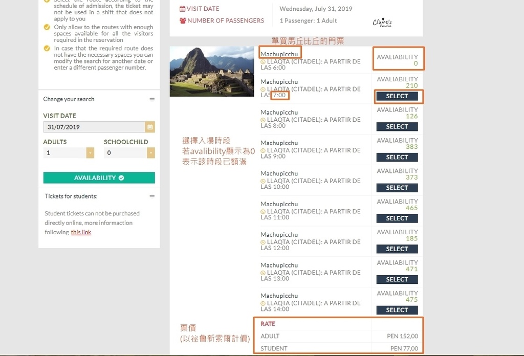 入場時段最早從早上六點開始,但是每個場次都有限額,若avalibility底下的數字為0,就表示該場已額滿了,如果想要早一點入場的話,建議還是提早購票比較好~下方會有票價,馬丘比丘的門票都是以祕魯新索爾(Sol)計價。選好想要的場次,按下Select後進到下一個步驟。