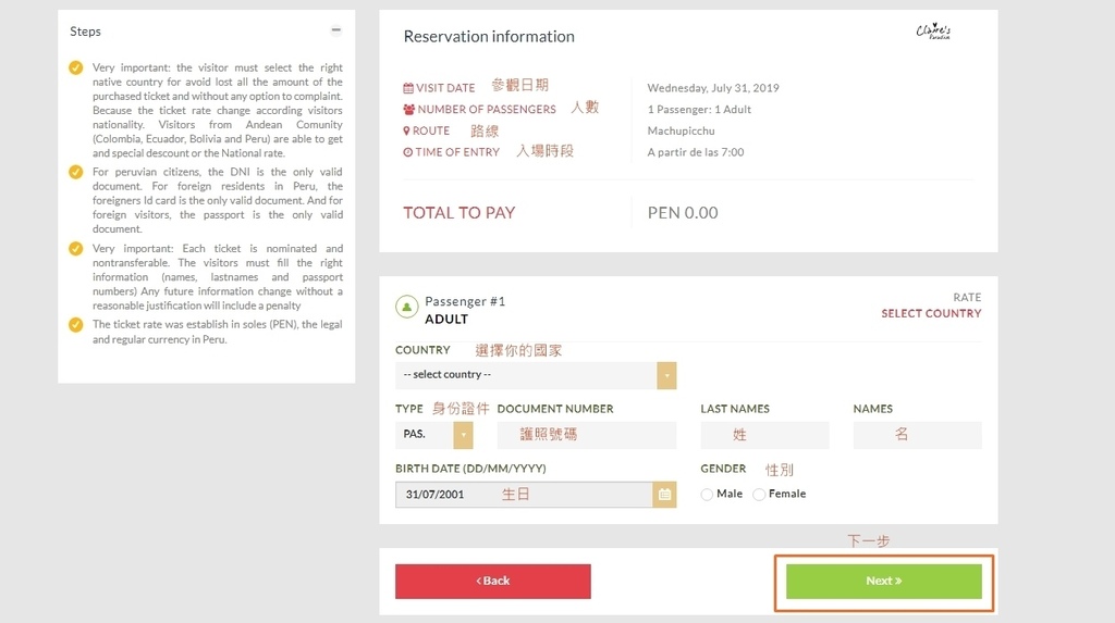 頁面上半部是你的購票資訊,下半部則需填入與護照相同的基本資料。填寫完畢之後按Next進入到下一頁。