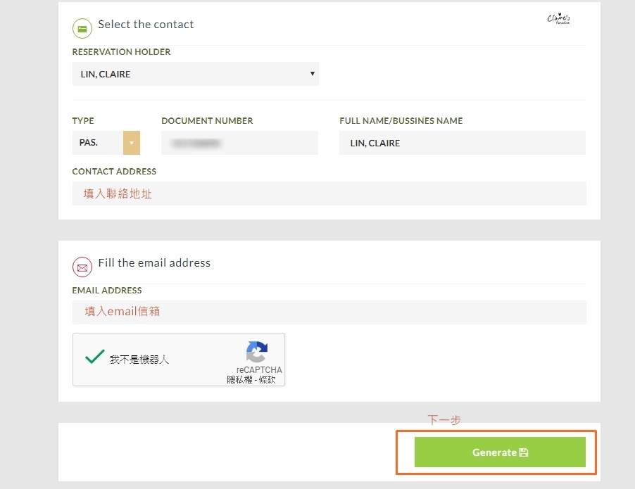 上半部一樣是你的購票資訊,往下拉會有需要填寫聯絡地址與email的欄位,填寫完畢後按Generate進入到下一步。