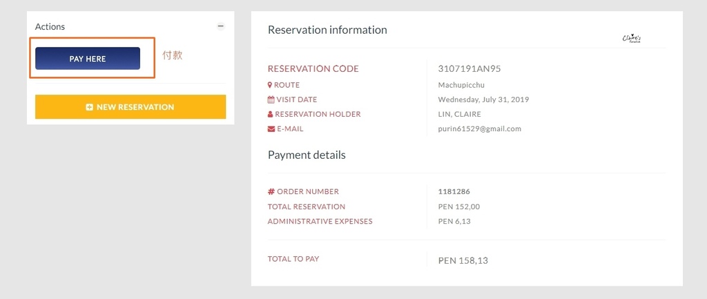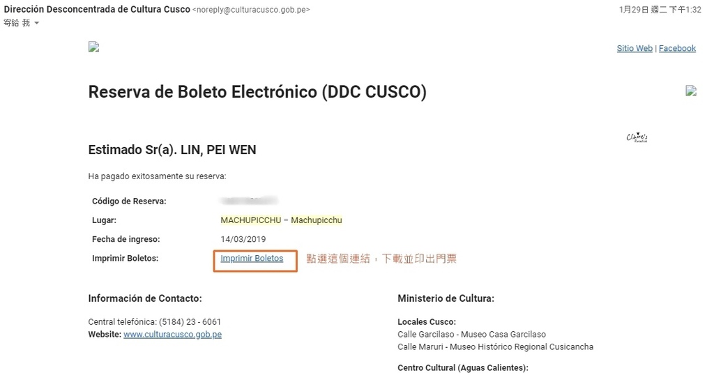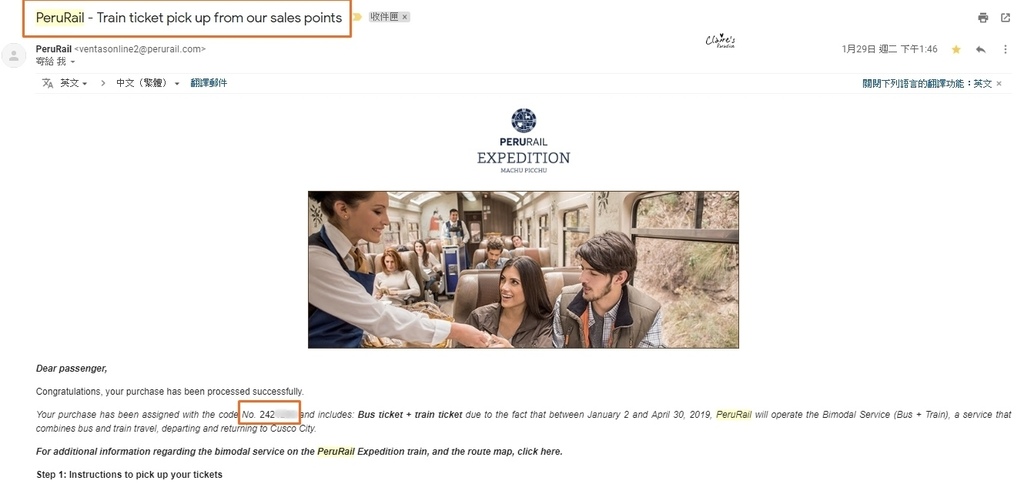 如果收到的信件標題是”Train ticket pick up from our sales points”,而且信裡沒有夾帶任何的附件,那就表示你需要到PeruRail門市去兌換車票。兌換的方式很簡單,準備好訂票編號(email開頭即有編號,如同下方橘色框框處)以及護照還有當初購票時使用的信用卡即可,信件下方列出了PeruRail的門市,武器廣場旁邊就有一家了。