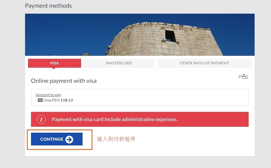 在這個步驟可以看到預約號碼已產生,把頁面往下拉,可以選擇信用卡種類(Visa或Mastercard),按Continue進入到付款流程。
