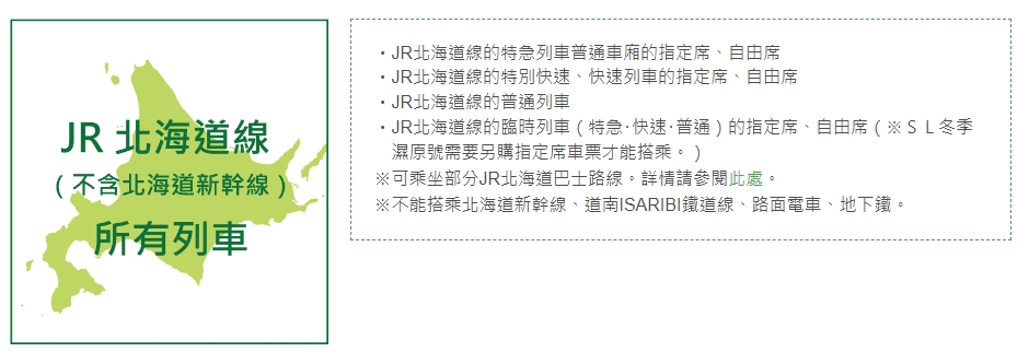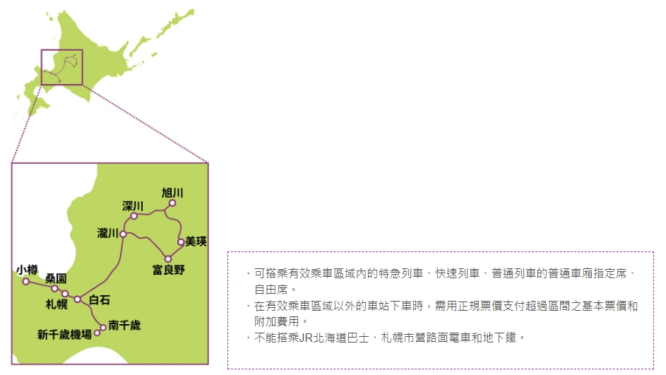 若整體行程的路線較長,且包含了北海道的各個區域,那麼可以考慮購買北海道鐵路周遊券(5日/7日/10日),使用範圍與可搭乘的列車如下圖。
