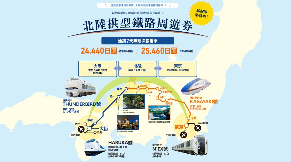 若想一次遊覽東京、大阪、北陸地區各大城市,那麼這張北陸拱形鐵路周遊券(7日)就很適合你! 持有這張票券,可以在7天內無限次搭乘北陸新幹線、東京與大阪的JR,還有直達東京成田與大阪關西機場的N’EX號、Haruka號也都在使用範圍之內,點這裡可以看JR官網說明詳細的使用方式與路線。