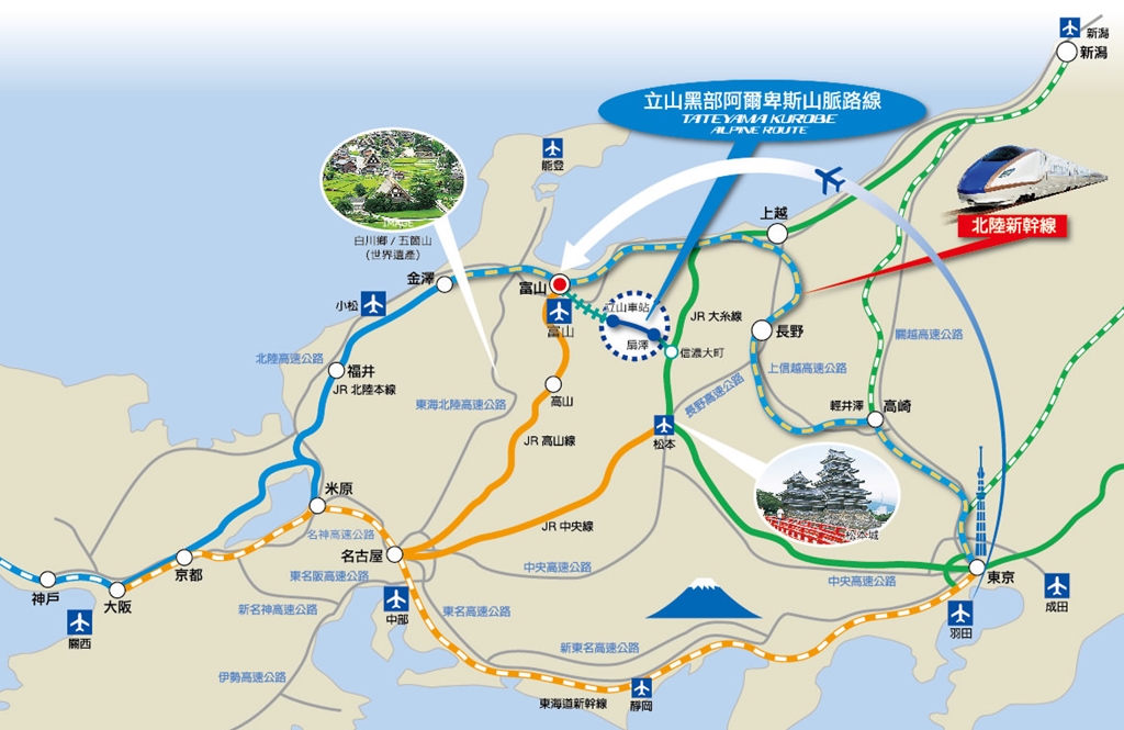 想來立山黑部旅遊,比較簡單的方式是從名古屋進出,順著玩一圈中部北陸地區,但不論是從東京、大阪、名古屋、金澤、富山等地出發其實都可以,只要搭配新幹線與巴士就沒問題了。