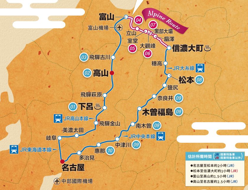 如果是從名古屋進出的話,首選的交通票券就是這張JR 立山黑部阿爾卑斯&高山&松本地區周遊券(5日),中部北陸地區的重要景點都包含在這張票券的使用範圍之內,像是飛驒地區、高山、松本、下呂溫泉、當然也有立山黑部,在五日內可無限次搭乘路線上的JR在來線、特急、立山黑部路線,點這裡看JR官網的詳細說明。