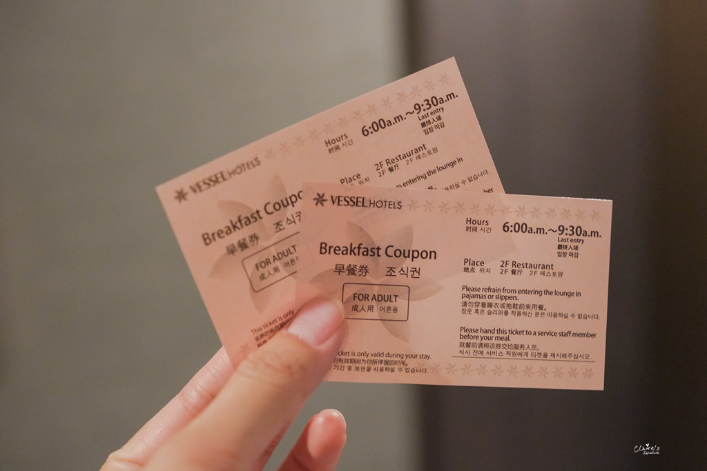 餐廳位於二樓,入住時會獲得兩張早餐券,用餐前把餐券交給服務人員即可。早餐時段是早上六點到九點半,不過根據我們的觀察,大概九點左右,服務人員就會開始陸續整理了,所以不要壓線來用餐比較好。