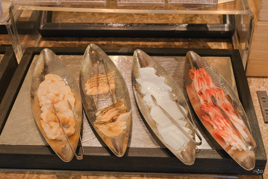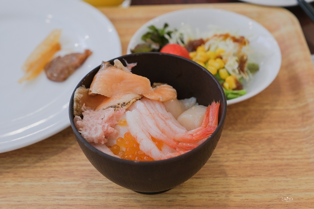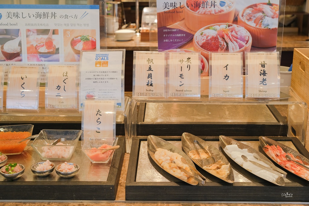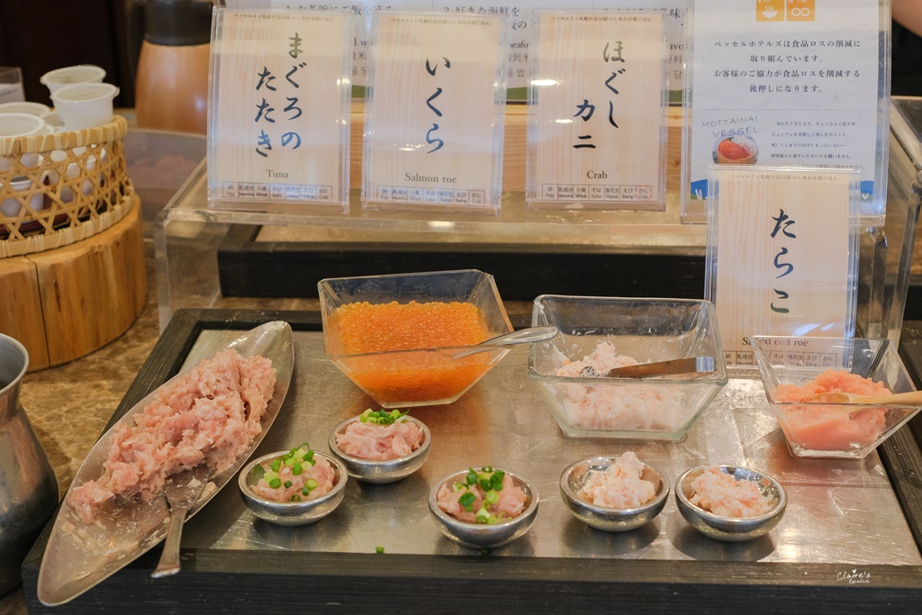 當然,早餐的主角非海鮮莫屬了,這裡每天提供八種新鮮的海鮮,我們當天吃到的是干貝、甜蝦、鮭魚卵、炙燒鮭魚、花枝、蟹肉、鮪魚泥…等,一旁有醋飯,可以自己製作一碗料多味美的海鮮丼,想加多少海鮮都可以!(即時房價查詢:Agoda/Booking.com)
