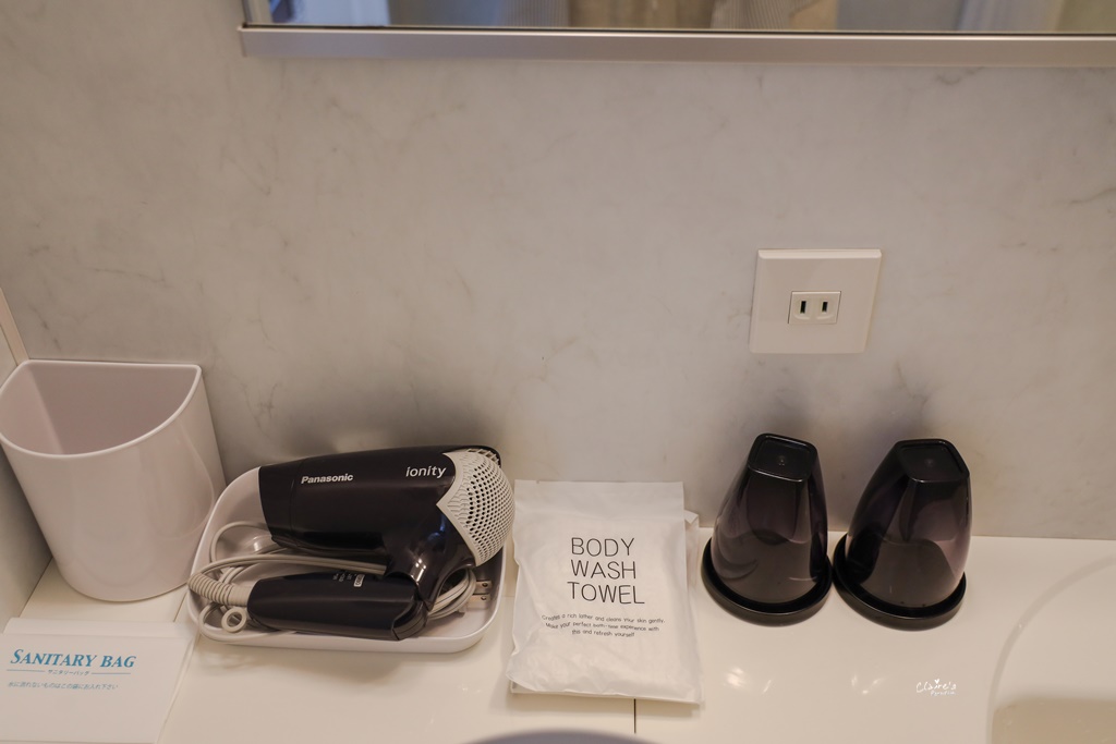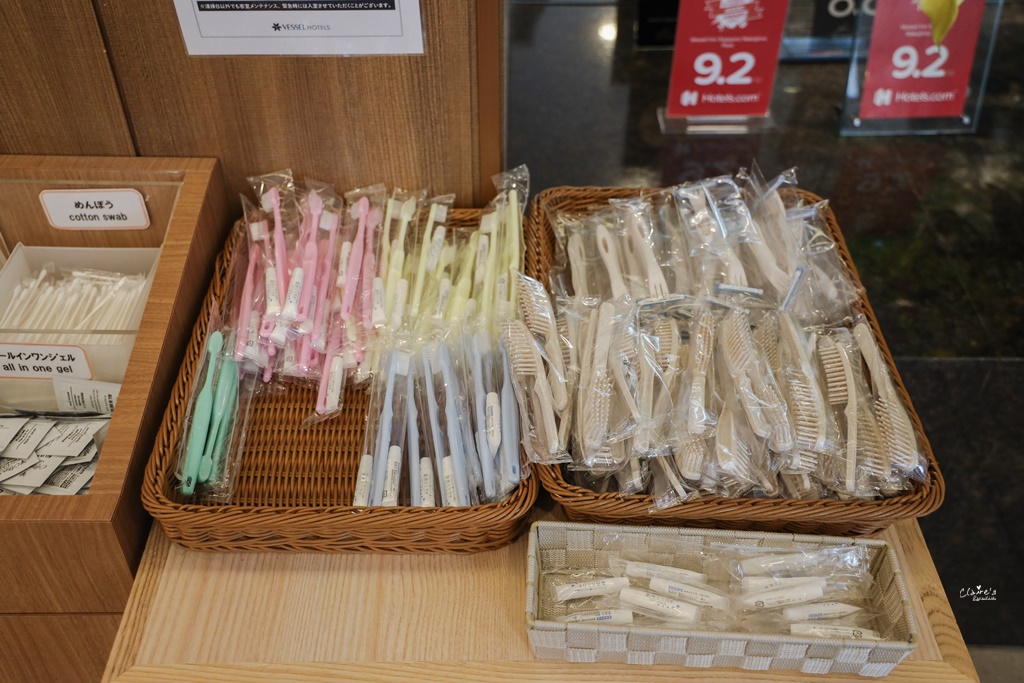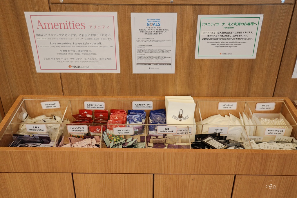 現在為了環保,房間內大多不會提供一次性備品,如果有需要的話,可以自行在大廳取用。這裡的備品滿齊全的,除了基本的牙膏牙刷、浴帽、梳子…等,還有不同味道的入浴劑以及乳液、化妝水。