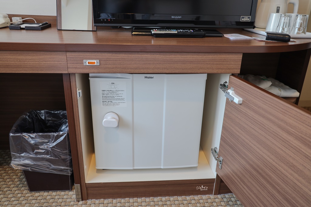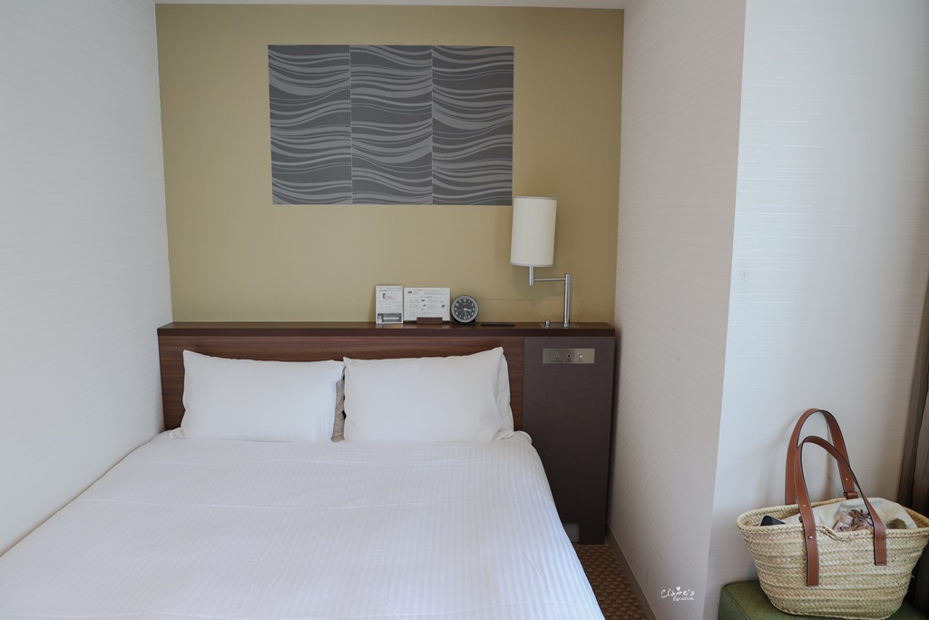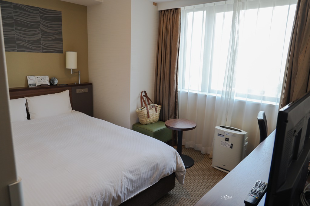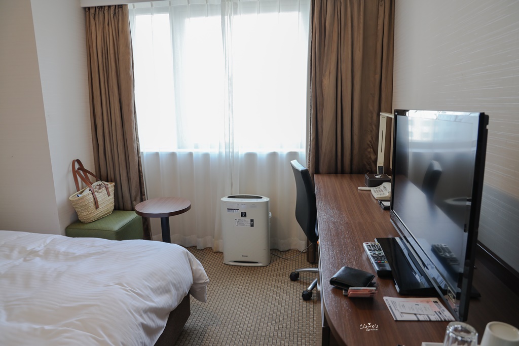 單人房的大小約4.8坪,床的寬度是140公分,以兩個成人來說有那麼一點擠…房間的配置和其他日本的連鎖商務旅館滿類似的,一打開門看見的就是一張床、書桌、窗邊還有一組桌椅,以及一台具有加濕功能的空氣清淨機。