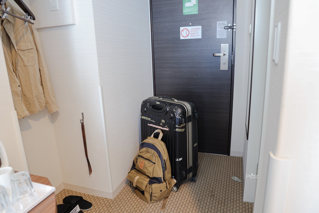 我們帶的是一個29吋的行李箱,要打開攤平的話,只能放在門口,而且打開後走道就只剩下一點點空間了,不適合攜帶多件大行李箱的人。但是房間雖然小,整體來說滿乾淨的,採光也很好。