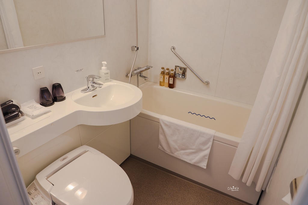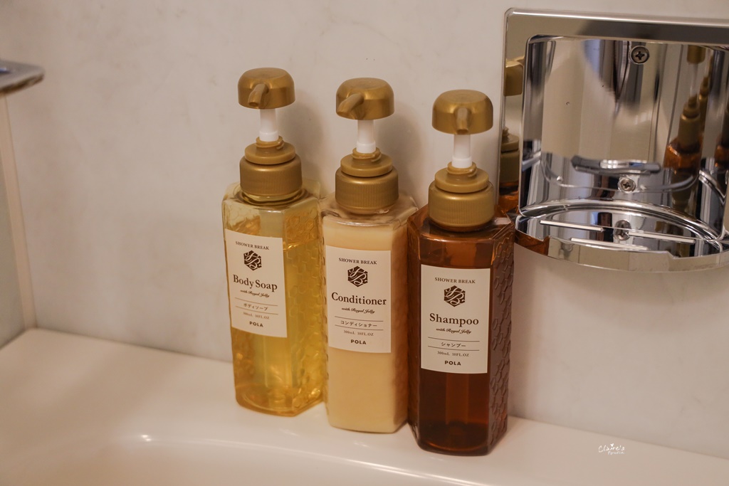 浴室的部分是一體成形的衛浴設備,雖然浴缸很小,但還是勉強可以泡澡。沐浴乳的品牌是POLA,我滿喜歡這個品牌的,味道聞起來很舒服。(即時房價查詢:Agoda/Booking.com)